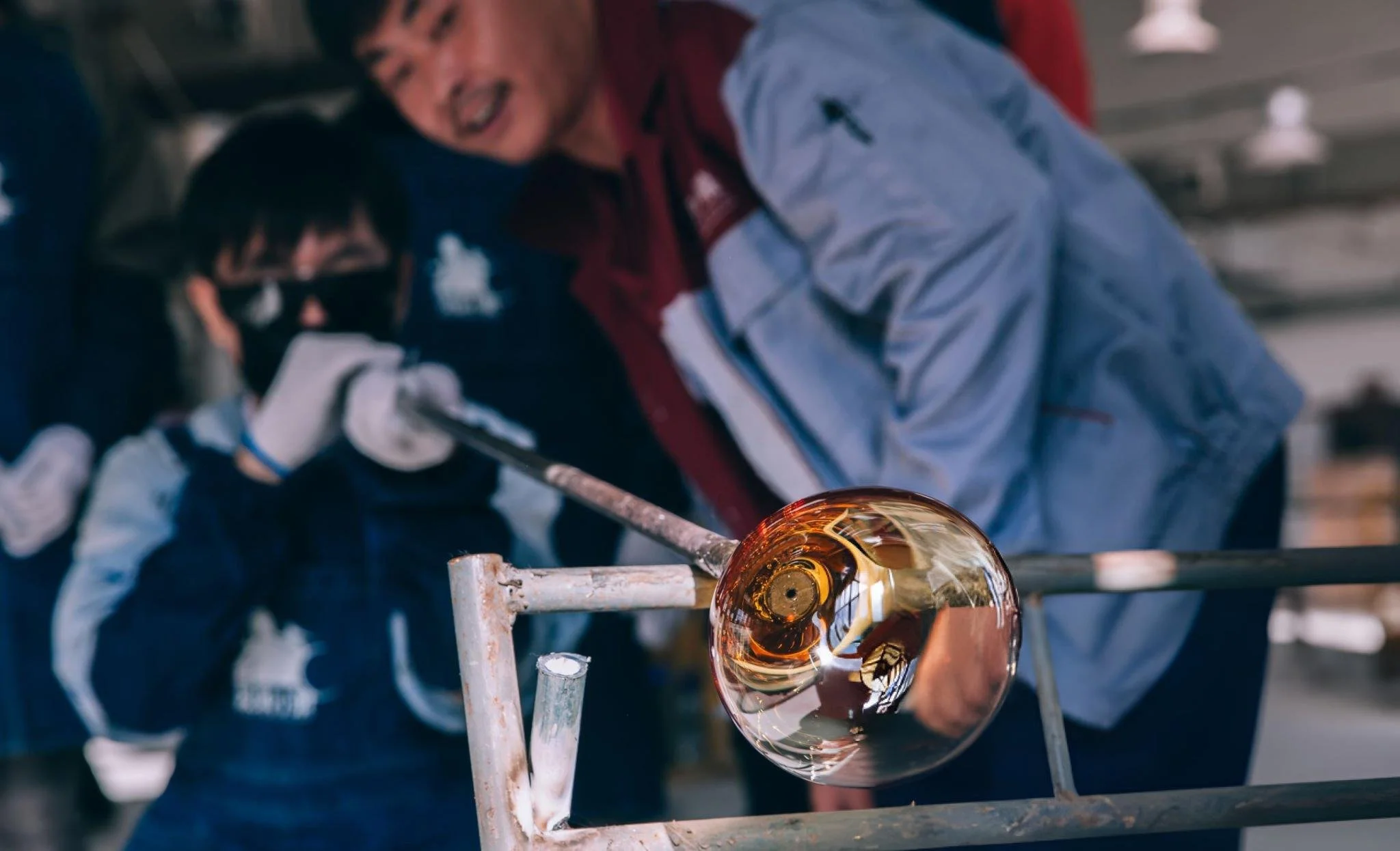 Instead of polishing in a logo after it cools, each piece is stamped while molten. That mark is pressed into the glass when it's still glowing soft, not after the fact. You can run your fingers across it and feel how it's part of the glass, not just sitting on the surface. It's not just telling you where it came from. It's showing how.